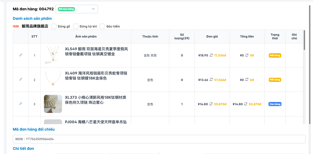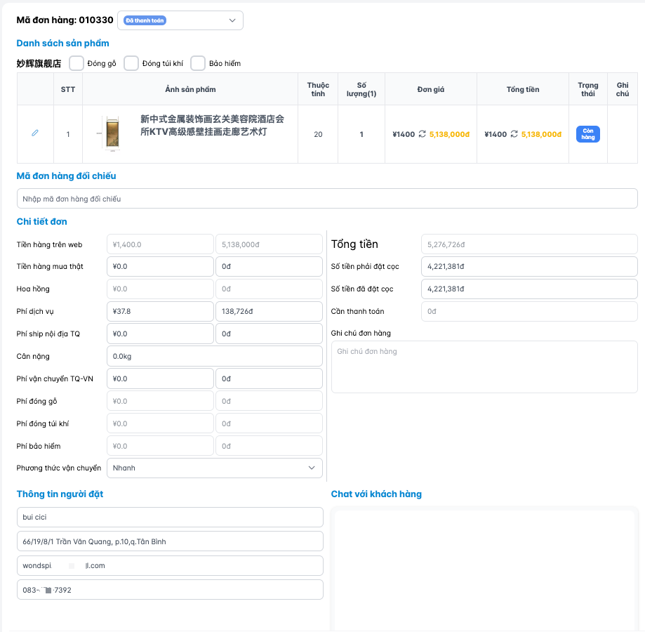 - Thể hiện chi tiết các khoản như: Hoa nồng nếu có, phí dịch vụ, phí vận chuyển nội địa TQ, trọng lượng/số đo của kiện hàng, phí cân nặng, phí gia cố kiện hàng, phí bảo hiểm, kiểm hàng, các phương thức vận chuyển, số tiền khách hàng cần cọc, và số tiền còn lại cần thanh toán, ghi chú cho đơn hàng, thông tin của khách hàng và phần chat trực tiếp với khách hàng